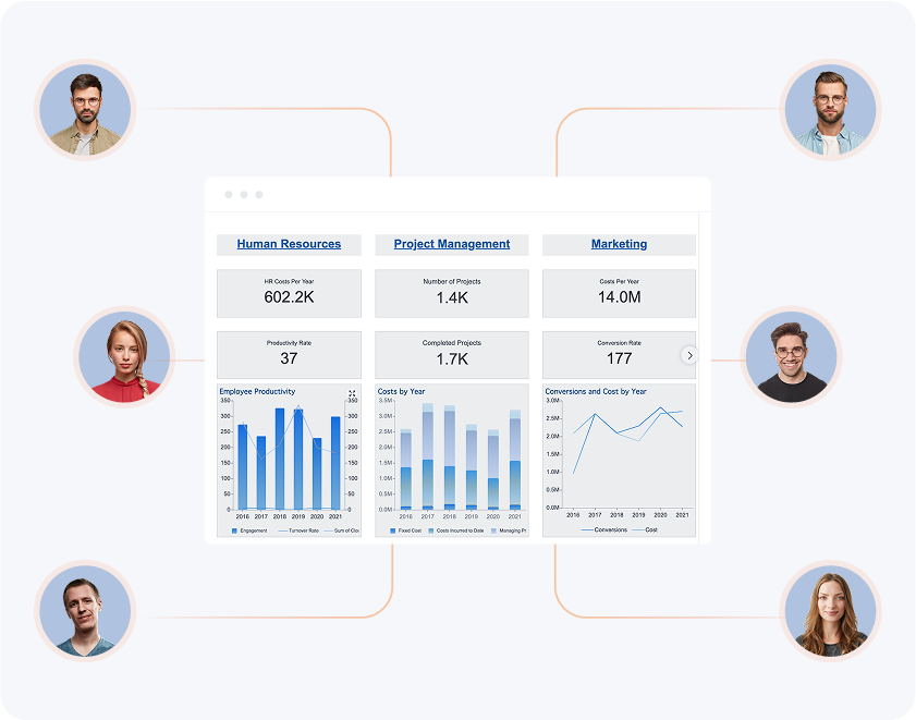 • Admins and end-users to easily manage, view, edit, and distribute their dashboards from a centralized portal.