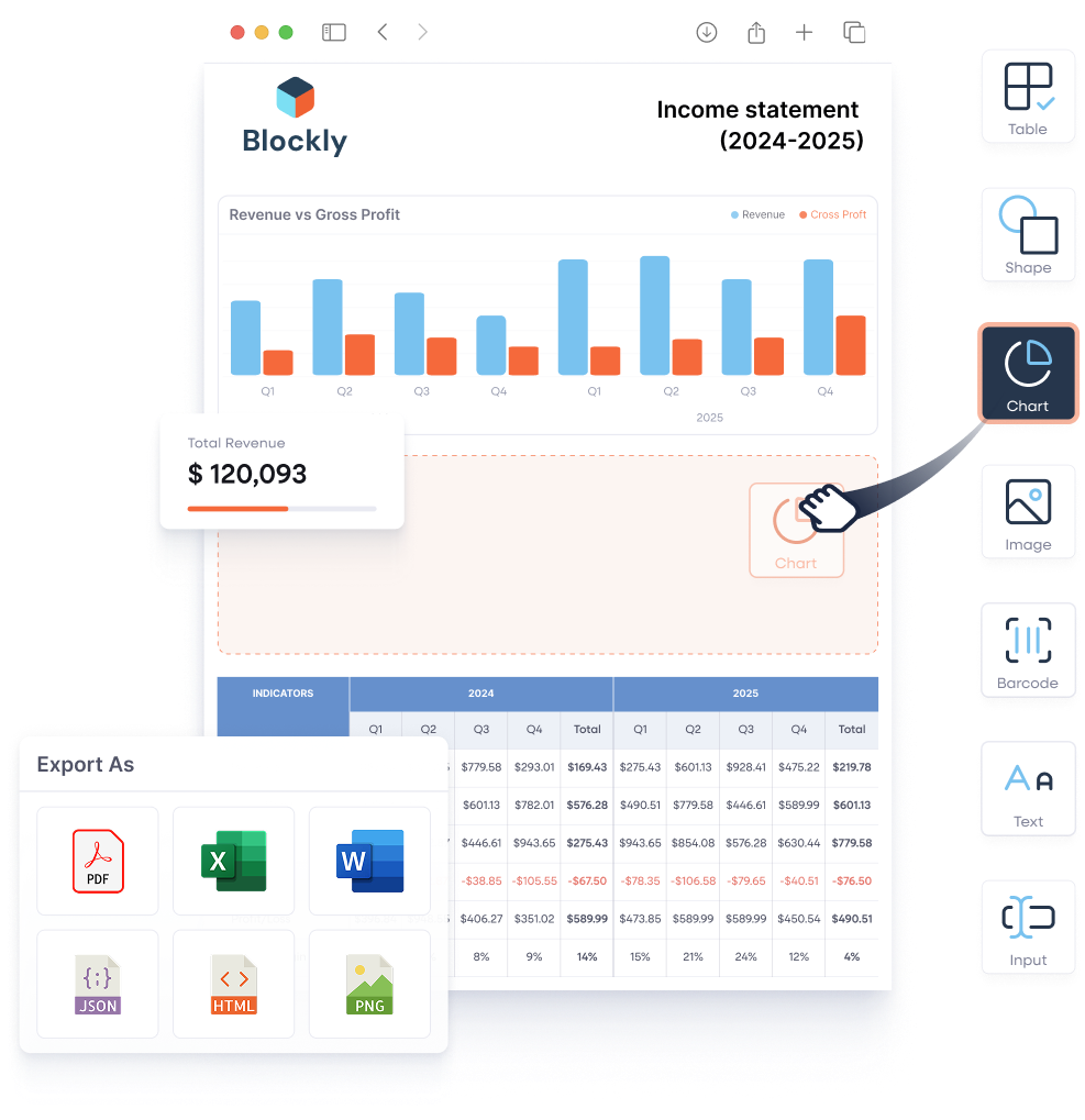 • Export to popular formats including PDF, Excel, Word, CSV, JSON, HTML, and PNG.