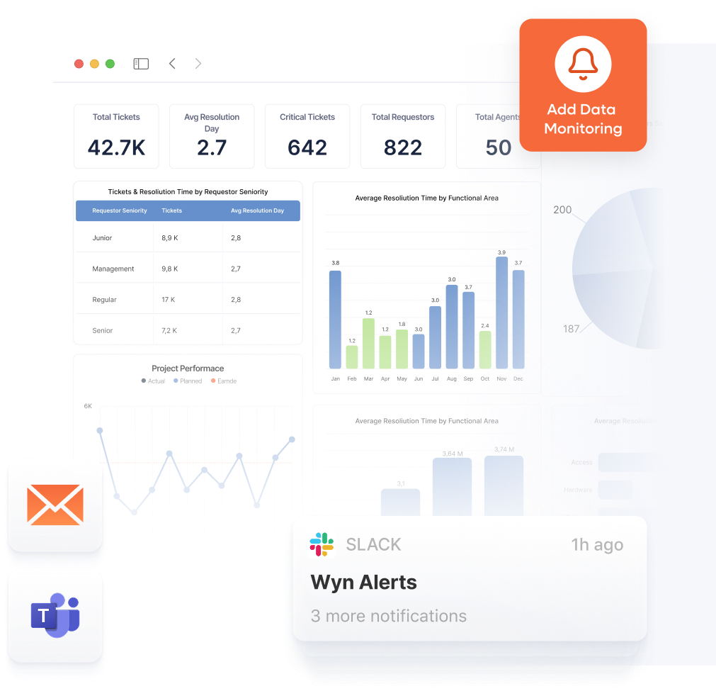 Wyn Alerts automatically deliver insights through your favorite communication tools — Slack, MS Teams, or email — so you can react fast, reduce analysis time, and stay focused on what matters most.