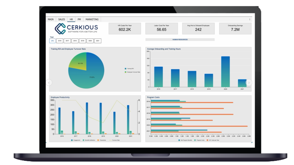 Human resources can better understand employee data with a CEO dashboard.HR can align with executive management to better understand HR costs per year, the average time it takes to onboard an employee, training ROI, average employee turnover rate, employee engagement, and productivity.
