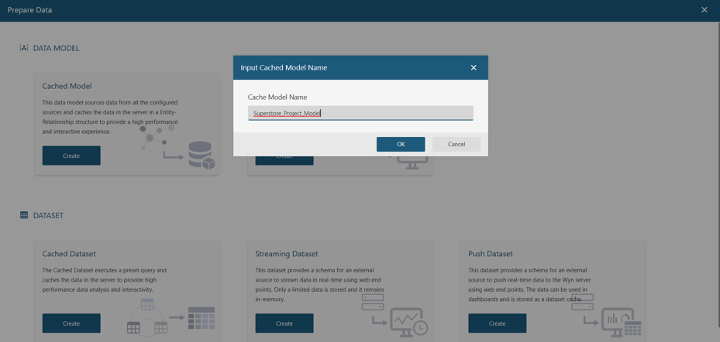 First, click + and select Prepare Data under the DASHBOARD section. Select Cached Model, which will load the following view:
