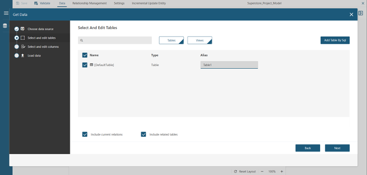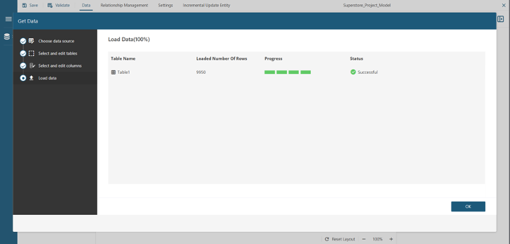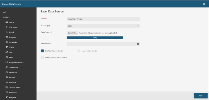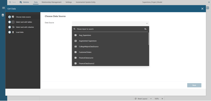 Then, click on Get Data at the top of the page. Select the data source you would like to create a model for. Next, select the Augmented Superstore dataset you just loaded and click Next.