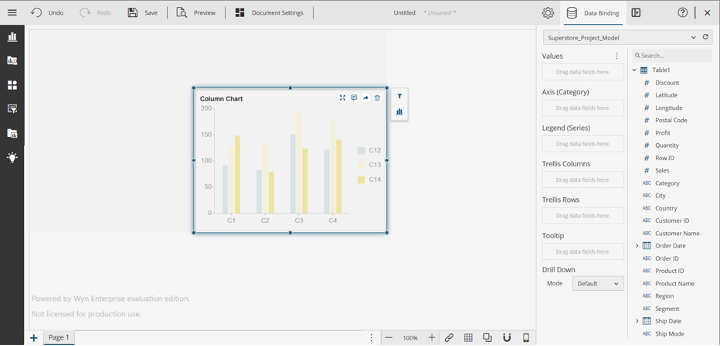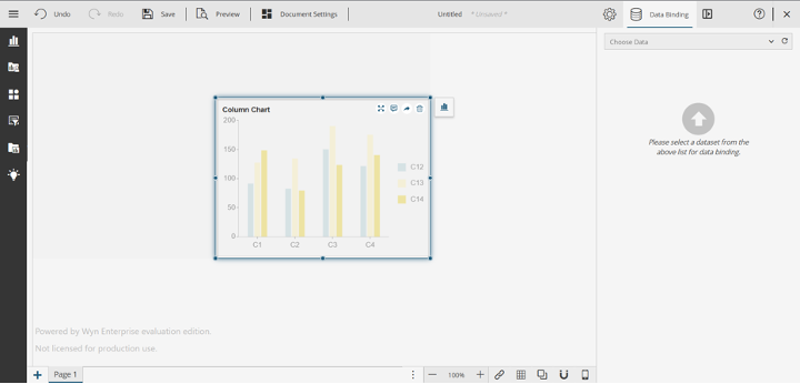When you drag and drop the column chart, Wyn will recognize that you haven’t selected any data for the dashboard and will automatically open the Data Binding panel, where you can select your data source.