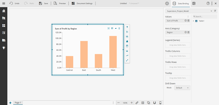Add data to your chart to build a column chart showing the total profits by region. Profit is a numeric variable that you can drag and drop into the Values box. Next, drop the category variable Region in the axis by dragging it there (Category). Vertical bars indicate how the profit for each region is displayed on the final graph: