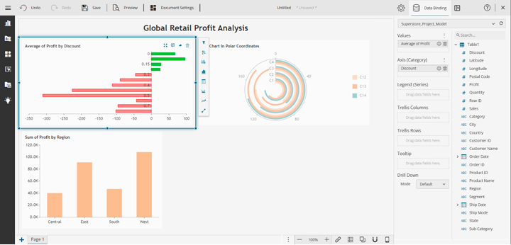 Next, use a bar chart to visualize the effects of discount offers on profit. Drag and drop the Bar Chart component from the charts section in the sidebar into your canvas. Then, drag the Profit variable into Values, select Average as the aggregation methods, and drag the Discount variable to the Axis box. Here’s your expected result: