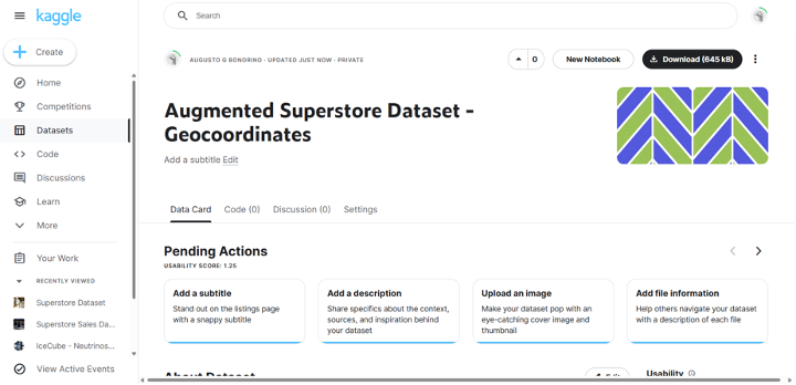 For this demonstration, download a sample dataset from Kaggle, a popular online community for data science and machine learning. The Augmented Superstore Dataset is a curated collection of geocoordinates. The data includes transaction records for a hypothetical global retail store. It holds information about profits, sales, and other relevant KPIs among cities, segments, and shipping modes.