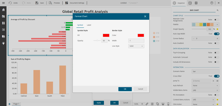 Select the average profit as the target value and the Less Than condition. Since you’re interested in negative values, compare the average value to 0. Finally, click Style and choose red to fill the bar and its borders, selecting a value of 50 for opacity to support readability. Note that the filled bar may overlap with the y-axis labels. Then, click OK and apply the format to the chart: