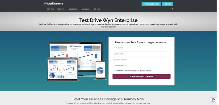 To download the latest version of GrapeCity’s Wyn Enterprise, visit the Wyn website, click Try Free in the top right-hand corner, and select the 30-day test drive option.