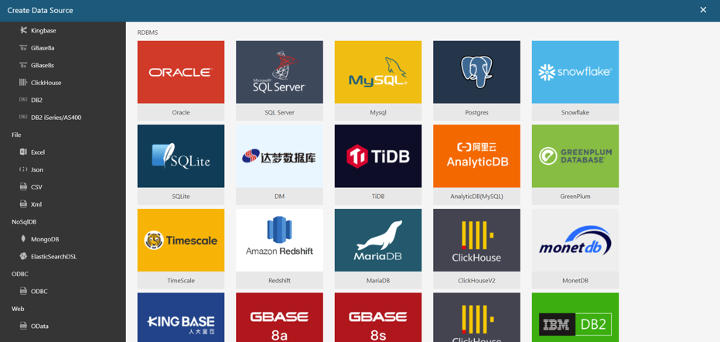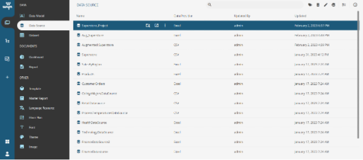 From this view, you can connect to existing data sources, upload files from your computer, and create new data sources from existing datasets. For this tutorial, you’ll connect to a database and load the dataset. Note that Wyn supports multiple data source forms, including big file formats, big data, and relational databases. This flexibility ensures that Wyn can be easily integrated with your own data source.