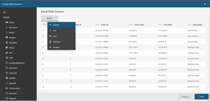Before you create the data source, Wyn allows you to edit the columns’ data types and names by clicking on the names or dropdown menu next to each name. You don’t need to edit the data for this tutorial, so just click Create.