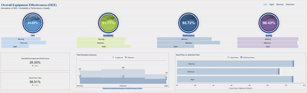 The below Overall Equipment Effectiveness (OEE) manufacturing dashboard is using the Wave Chart to visualize KPIs (overall equipment effectiveness, availability, performance, and quality).