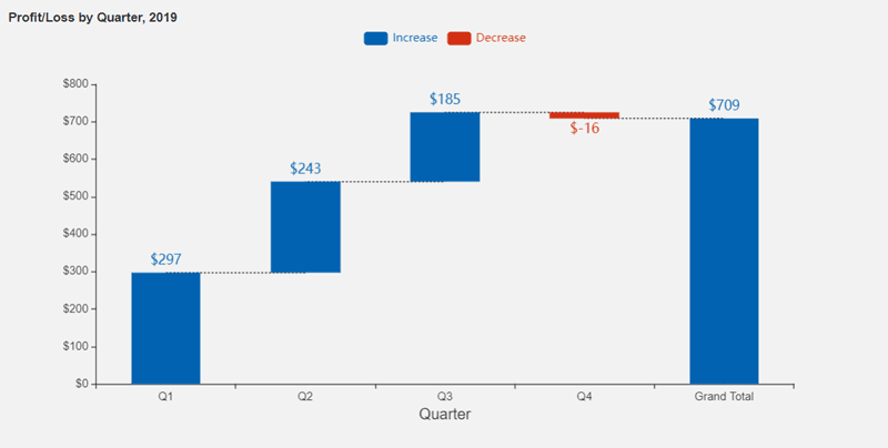 This visualization shows the cumulative result of sequential positive and negative values. Typically, these values are categorical or time-based. This visualization is often used in finance to show how NET values are calculated from a starting value.
