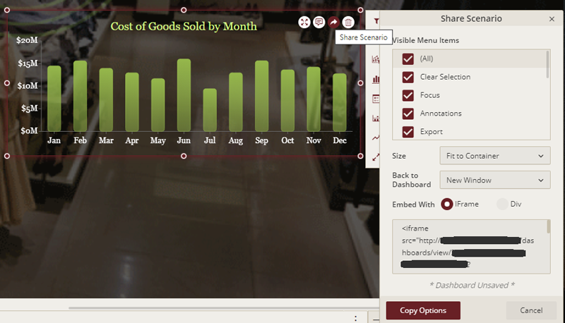 Select the scenario/visualization that you wish to embed and click on the ‘Share Scenario’ option at the top right corner. From the popup you can select/deselect options you wish to include/exclude and click the ‘Copy Options’ button to copy the markup.