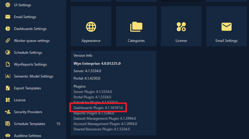 Note: The version specified in the above references must be the same as that of the Dashboards Plugin that is installed on the Wyn Server. It can be found through the Admin Portal.