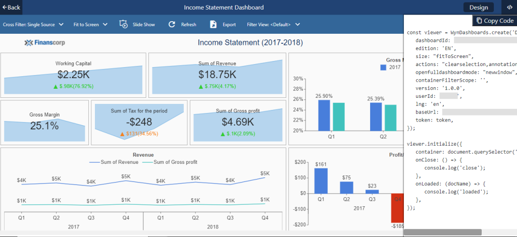 You can embed Wyn’s Dashboard Viewer and Designer components in your own custom internal applications or commercial websites using two methods: