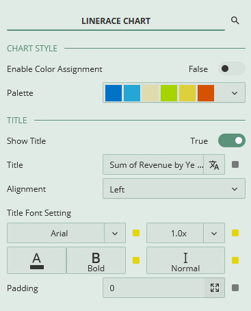 Title will give you all the settings to control the title text on the visual. It is automatically filled in based off of the values you selected in the binding area, but it can be edited and even set up with localized content.