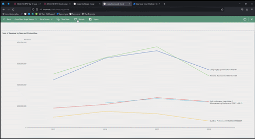 The lines move towards the end of the x axis, while showing the change from point to point. Depending on the data bound to the visual, there can also be exits and entries of series to the race as well with each line having a color and title that it chases across the screen.