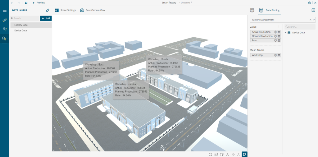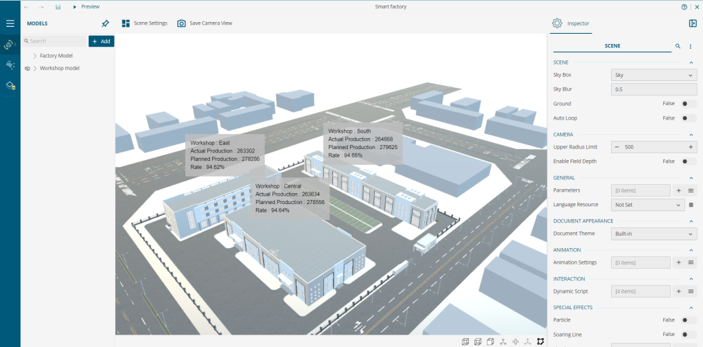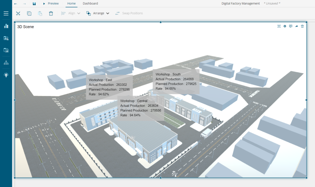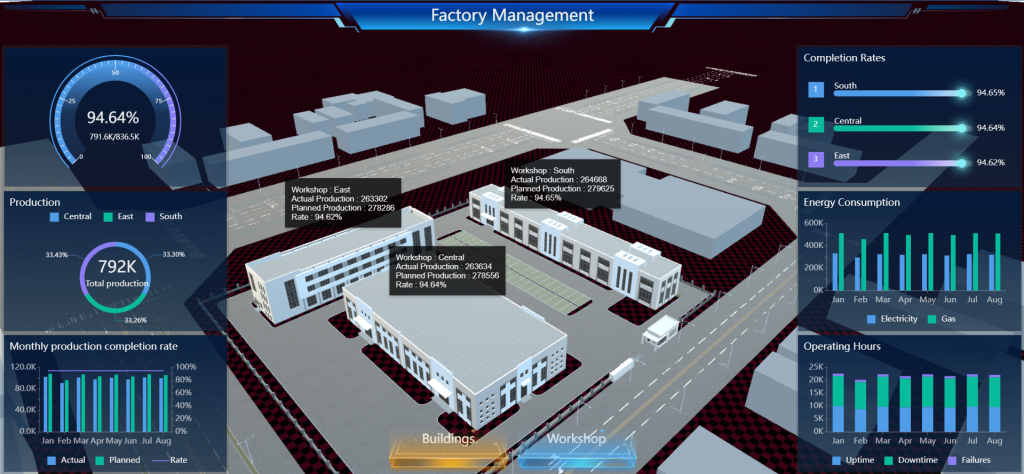 For example, in the Factory Management Dashboard below, we present the production data from different workshops in a factory on a 3D Model. It depicts clearly the information against the architectural location of the different workshops in a factory.