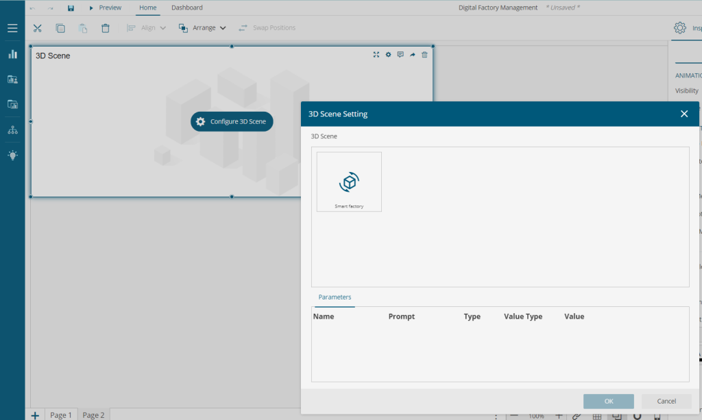 When you drag and drop the visual from the panel to the design surface, you will be asked to configure the 3D Scene for this visual. In the 3D setting dialog that opens, choose the desired scene and provide the parameters (if required).