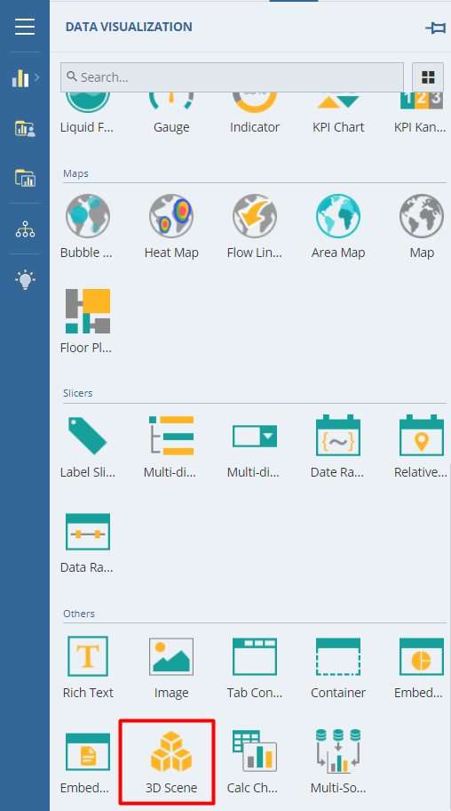 Once you have the desired 3D Scene with you, add it to the WynDashboards using the 3D Scene visual, which you can find within the Charts section in the Data Visualization panel.