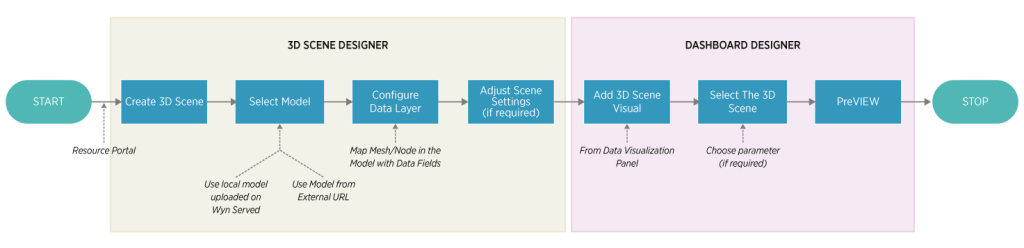 With Wyn Enterprise, displaying business data against a 3D Model requires the creation of a 3D Scene visual that provides an environment to bind the 3D Model with the data source. The complete process for working with a 3D Model in Wyn Enterprise is depicted in the flow diagram below: