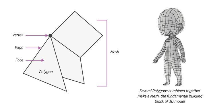 The 3D Model is formed by connecting polygons along edges in a virtual space. The polygon represents an enclosed area (or face) by joining the points (or vertices) in the 3D coordinate plane. The collection of these polygons is known as a Mesh, and it forms the fundament building block of 3D modeling as shown in the image below: