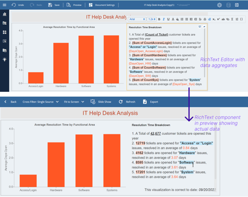 With the Rich Text component in Wyn Dashboard, such dynamic narratives (or summaries) for contextual information can be built using the data aggregations, context variables, or parameters as shown in the image below:
