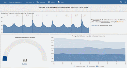 One of the tactics to guide the dashboard users through visualization, and how it works with other visualizations, such as a Slicer or Cross Filter, is to add brief instructions on how to work with the visualization. One can provide a relevant source of information, add a reference to the right document, or give a how-to-read kind of instruction.
