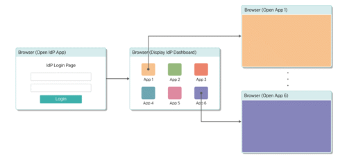 In an IdP-initiated SSO, the user logs into the IdP application containing all the internal and external applications for which the admin has configured SSO. The user clicks on the visual icon for the application and is logged in without prompting for credentials.