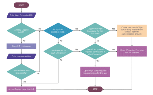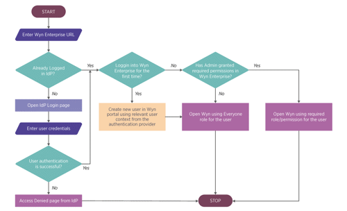 Wyn Enterprise supports to control incognizant access with selected providers. When you want to discourage incognizant access to Wyn Enterprise, the users should be imported to Wyn before setting up an SSO configuration. All the users in the external authentication server can perform the SSO process when accessing Wyn Enterprise but, only the users that are already imported to Wyn Server can log in successfully. Other users are redirected to the access denied page from the authentication provider as described in the flow diagram below:
