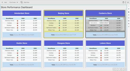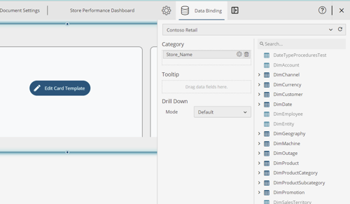 For the sample in this blog, the Card Chart is bound to a retail dataset based on Constoso Database, and the dimension “Store_Name” is selected as the Category field. This will generate the data visualizations added to the card in the previous step for each of the Stores in the database.