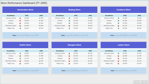 However, certain business dashboards demand analysis to be made using the same KPI instance(s) for each dimensionunder study. Such dashboard designs are often used to correlate, compare, and contemplate information for multiple dimensions simultaneously, for instance, an IT Server management dashboard that visualizes the metrics such as uptime, downtime, load handled, etc., for several servers together at the same time, in the same screen space. Other examples include a Production Line performance Dashboard, Stock Portfolio Dashboard for different companies, Student performance, Scorecards, and many more.