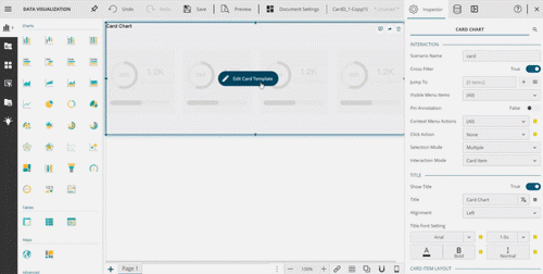 Once the card template is ready, you want to decide how these card items must appear in the preview of the dashboard. Configuring a card item’s layout is possible using the several properties available for Card Chart in the Inspector tab on the right. These properties can be set from within the Card Template Designer or by selecting the Card Chart on the dashboard designer.