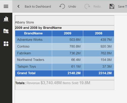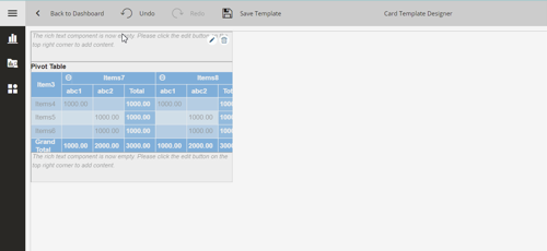 For this blog sample, we added RichText and Pivot visualization on the card to show the aggregated information for Revenue and Quantity, as shown below:
