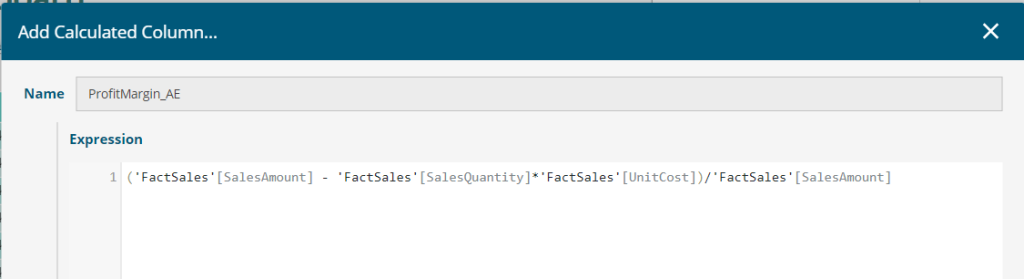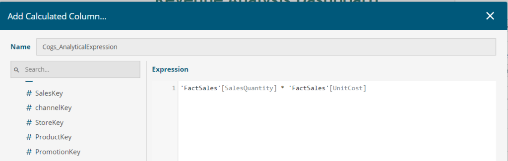 Add a Calculated Column for COGS, based on a simple expression multiplying SalesQuantity and UnitCost for every row as shown below: