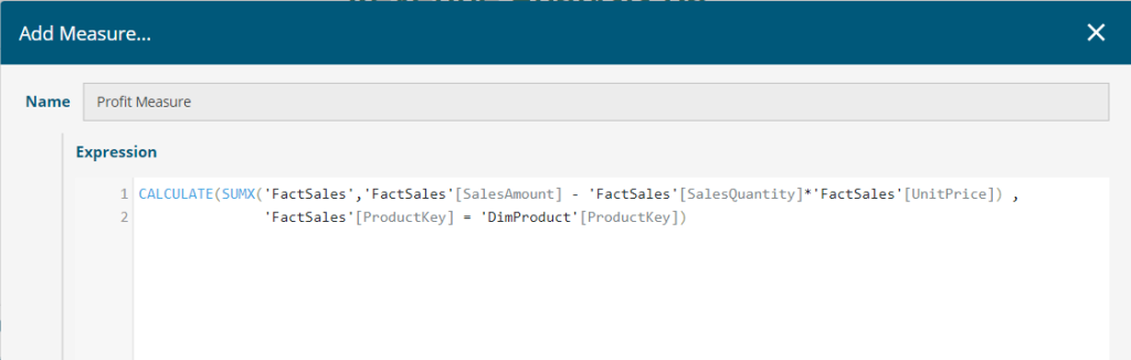 Add a Measure for the aggregated Profit using built-in function CALCULATE() and SUMX() to work on aggregated data from the model as shown below: