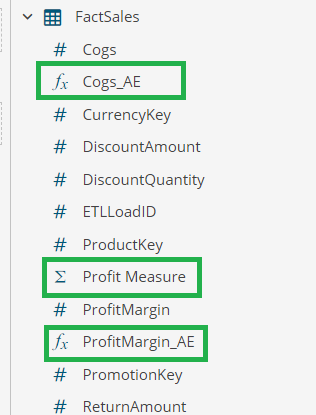 The Profit Margin is used in the aggregated KPI Chart and the Data Table. With the model, as you design the dashboard and encounter the need for COGS and Profit Margin measures to answer your data questions, you can use the Analytical Expressions to add these calculations to the FactSales entity.