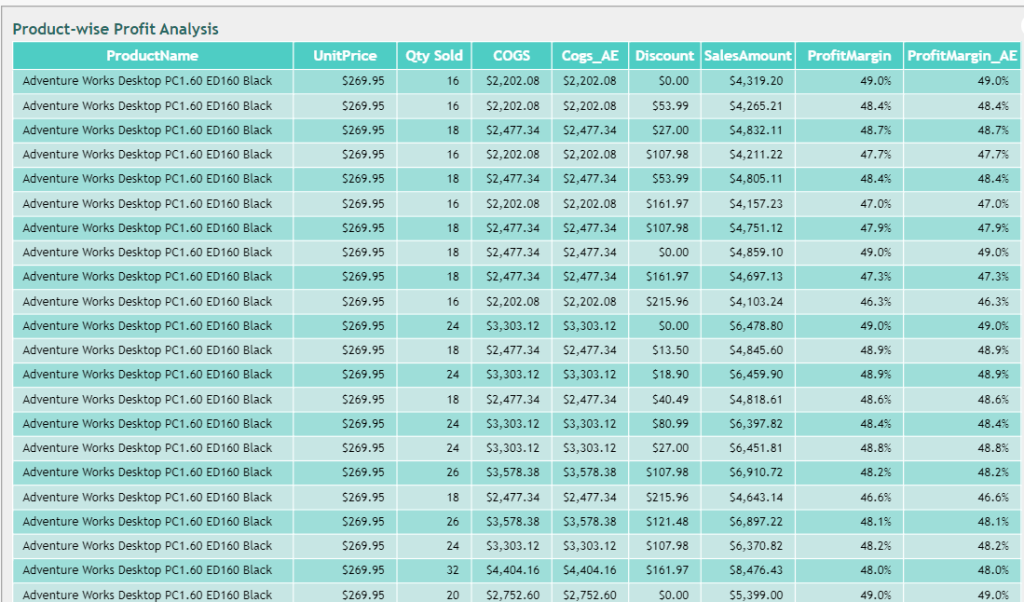 The COGS measure used in the Data Table shows individual products’ sale information from the earlier post.