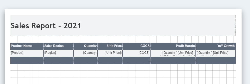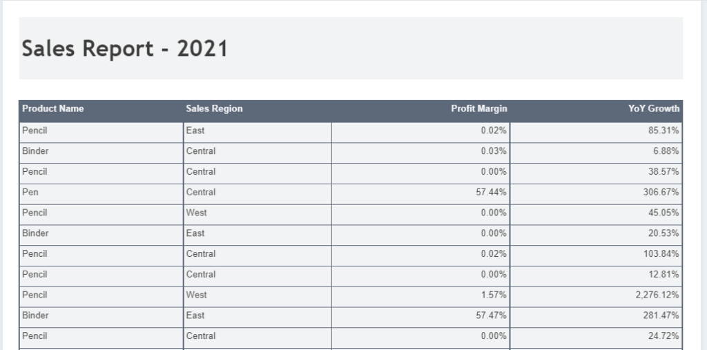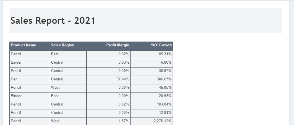 Suppose you need to present product sales data using a Table in the report. The report must show KPIs such as Sales Quantity, Sales Amount, Profit Margin, YoY growth, etc. along with other information such as Product Name, Sales Region, etc.
