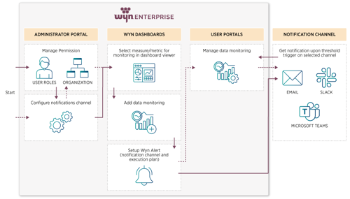 The diagram below depicts how data monitoring with Wyn Alerts works in Wyn Enterprise. It starts with configuring and managing permissions and notification channels on the Administrator Portal, goes through adding data monitoring on a measure, defining the execution plan, and selecting the notification channel in the dashboard. When the event occurs, Wyn Alerts trigger an alarm, and a notification is sent via the selected channel – Email, Slack, or Microsoft Teams, to the authorized business user.