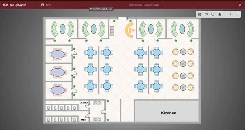 Next, click the marked image icon in the floor map designer to load a background image of the target floor map. In this sample, it will be the seating layout of our sample restaurant. Most image formats are supported, such as .svg, .gif, .png, .jpg, .jpeg, and more.