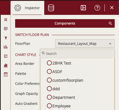 Once the floor plan control is inserted, you can load the custom floor plan you have created through the visualization toolbar, or through the \”Inspector\” properties panel on the right-hand side.