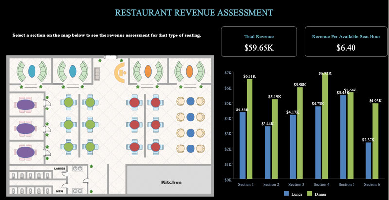 The screenshot shows the end result of our floor plan with some additional visualizations to help tie the dashboard together. A restaurant owner or manager can utilize this dashboard to view how much revenue is generated by individual sections of tables, or by various combinations of sections.