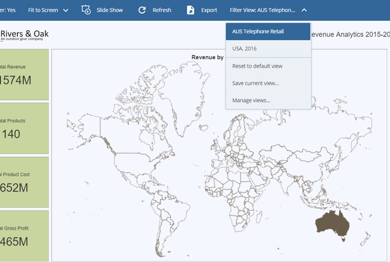 Visualizations on dashboards can now be exported directly to Excel. Slicer states and filters on dashboards can now be saved as Dashboard Filter Views at run-time, so users do not need to apply the same filter options each time the