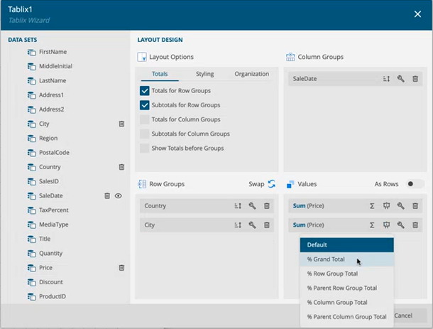 Also, within the Tablix Wizard, expressions have been added such as “% Grand Total,” “% Row Group Total,” “% Parent Group Total,” “% Column Group Total,” and “% Parent Column Group Total” for values. These expressions allow report designers to automatically have calculated fields within their Tablix.