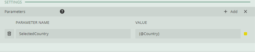 - On the parameters, add a parameter with a value that is the parent level parameter from step 3. In my example, my parent level parameter is “Country”, and my child parameter is “City”, therefore the value that I enter on this step is “{@Country}” and I named this parameter “SelectedCountry”.