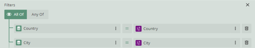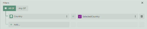 - Add two filters for each of these parameters. On the left side, the value will be from the dataset. On the right, it will be the matching parameter. The middle should show “=” for single selection and “[]” for in if you want multiple values.