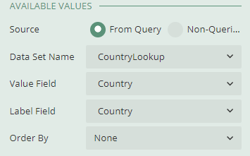 - Return to the parameters you made in step 2. Connect the available values to their corresponding data models. For example, the Country parameter will have the following available values set: