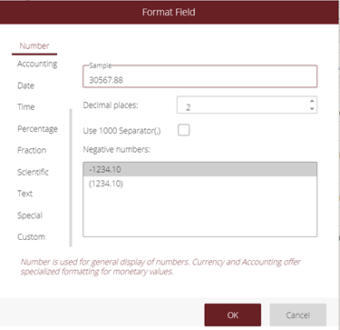 - The “Format Field” box will appear and here you can change the format of the number. The options include: General, Number, Currency, Accounting, Date, Time, Percentage, Fraction, Scientific, Text, Special and Custom.