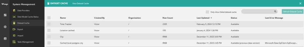 • After this you will want to restart Wyn and then go through and recache all of your datasets.